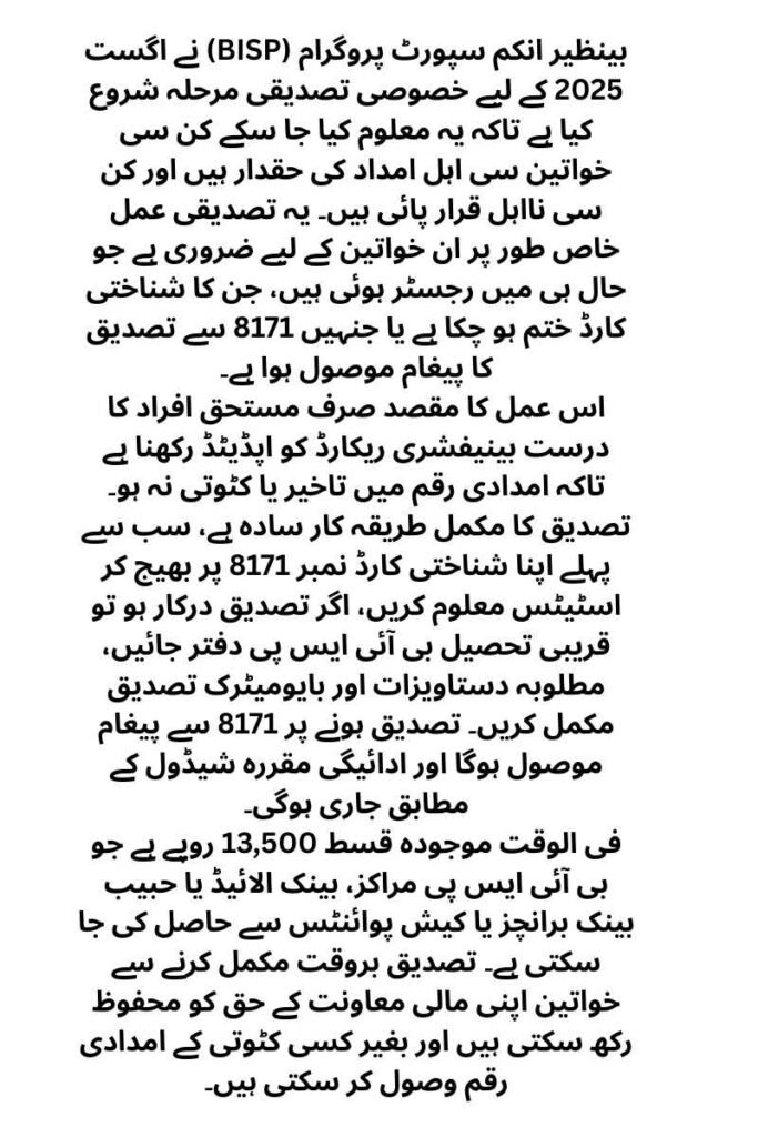 The Benazir Income Support Programme (BISP) has launched its September 2025 verification drive to ensure that financial aid reaches only the most deserving families in Pakistan. This verification round focuses especially on identifying eligible women beneficiaries who will continue receiving the Rs. 13,500 installment and filtering out those who no longer qualify under updated criteria.